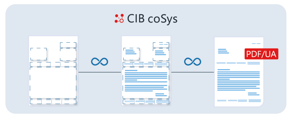 CIB coSys Template Management with the powerful CIB documentServer is a proven CIB solution for generating and managing documents in output management. All standard and dynamic templates are prepared in such a way that PDF/UA documents are automatically generated after mixing and merging customer data in the background. The result is high-quality documents that can be seamlessly integrated into automation processes - naturally using the BPMN platform CIB flow.