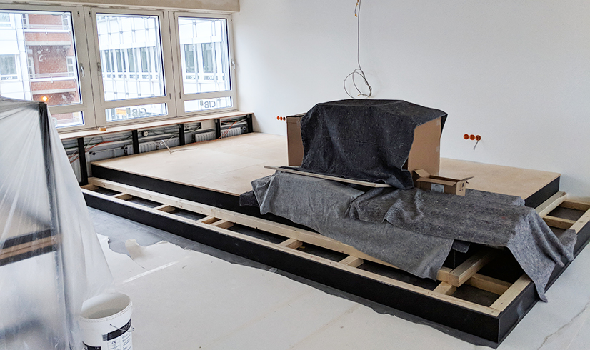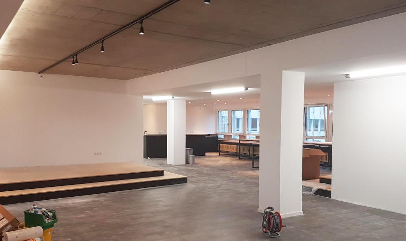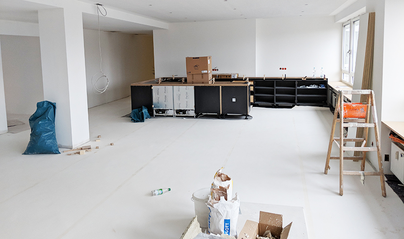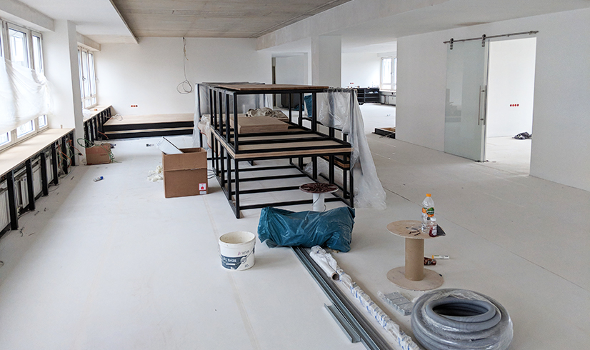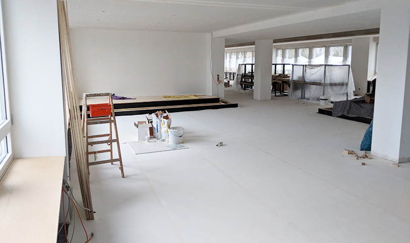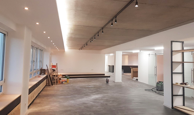 Es geht voran! Schiebetüren aus Glas wurden angebracht, Küchenzeile und Podium sind im Aufbau und die Wände strahlen in Weiß!