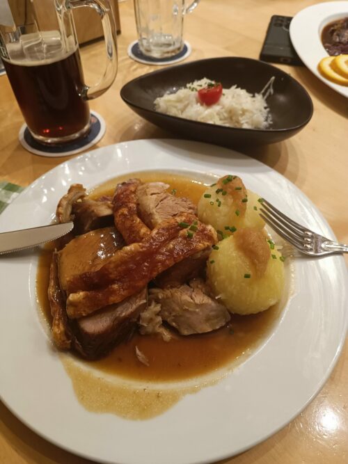 "We had dinner at the Paulaner restaurant and tried typical Bavarian food (Munich roast pork) and beer. It was really good. The highlight of the meal was the dessert (Kaiserschmarrn), which was only surpassed by the good company 😊".